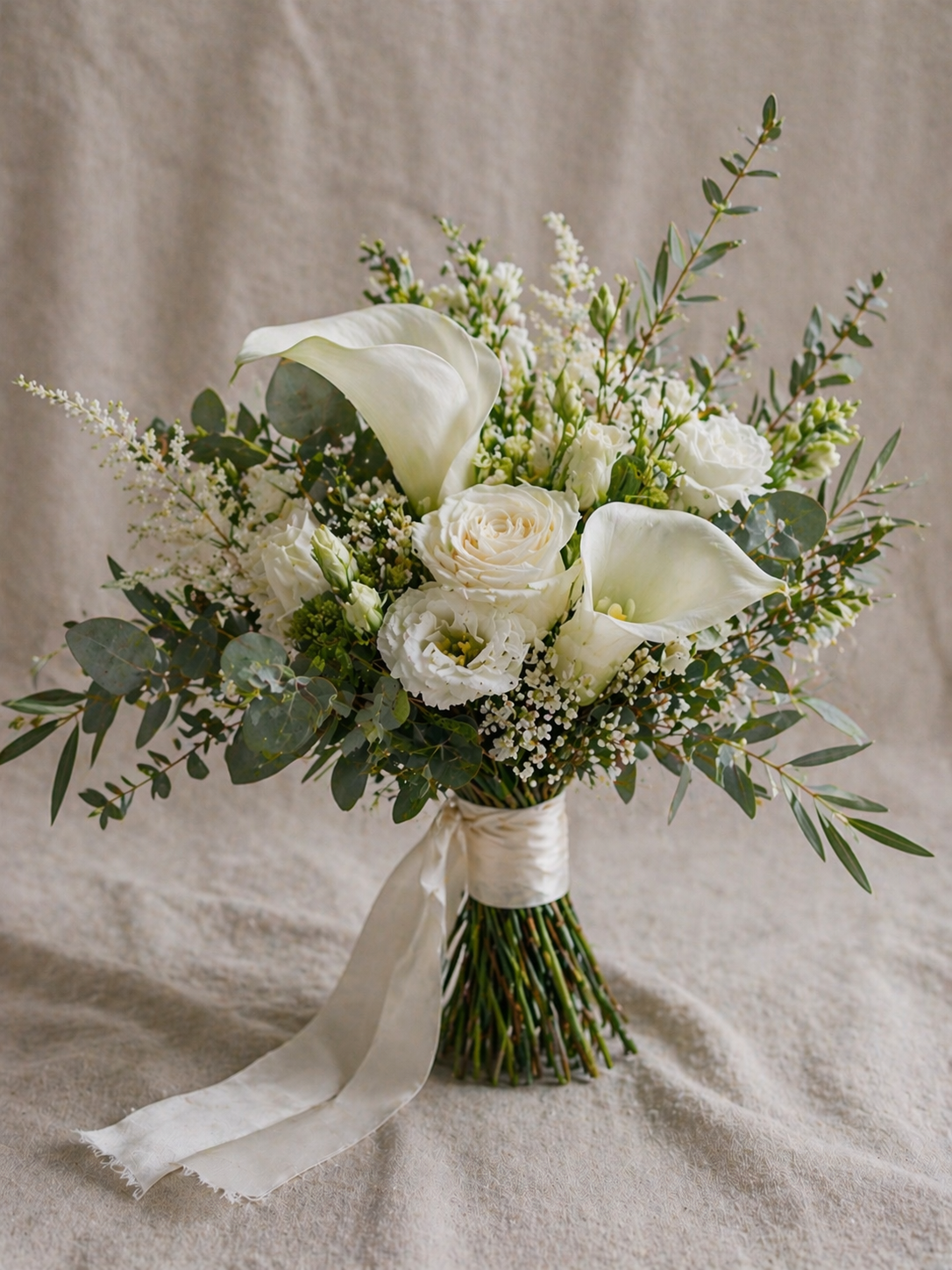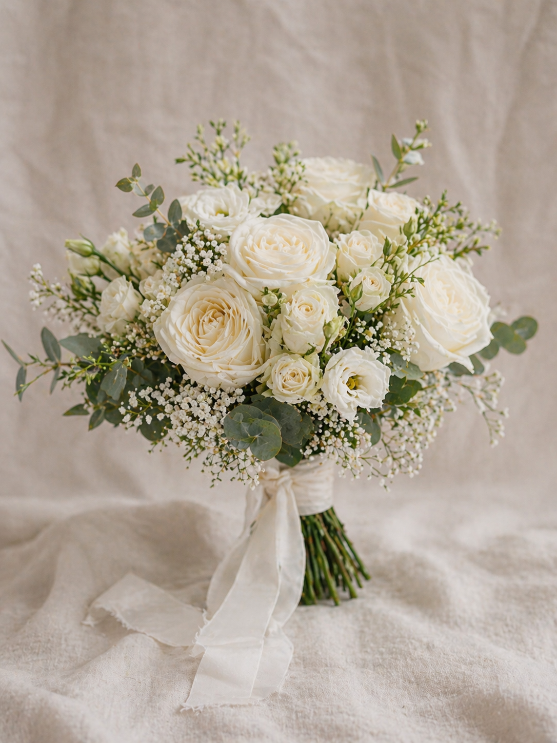 Ein zeitloser Brautstrauss in sanften Weiss- und Cremetönen. Feine Rosen, Ranunkeln und zarte Lisianthus verschmelzen zu einer klassischen, harmonischen Form. Der Duft ist leicht, elegant und unaufdringlich. Perfekt für Bräute, die auf schlichte Schönheit und stilvolle Zurückhaltung setzen.